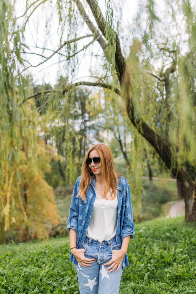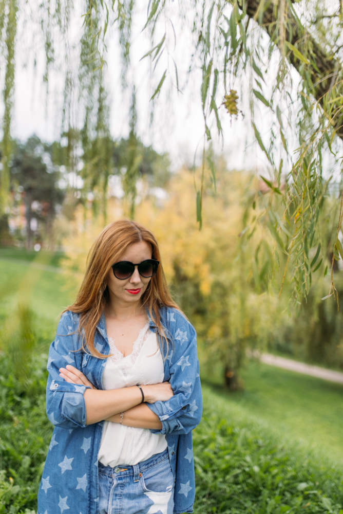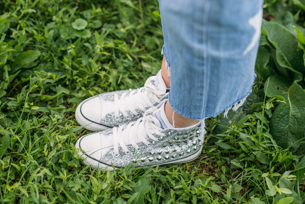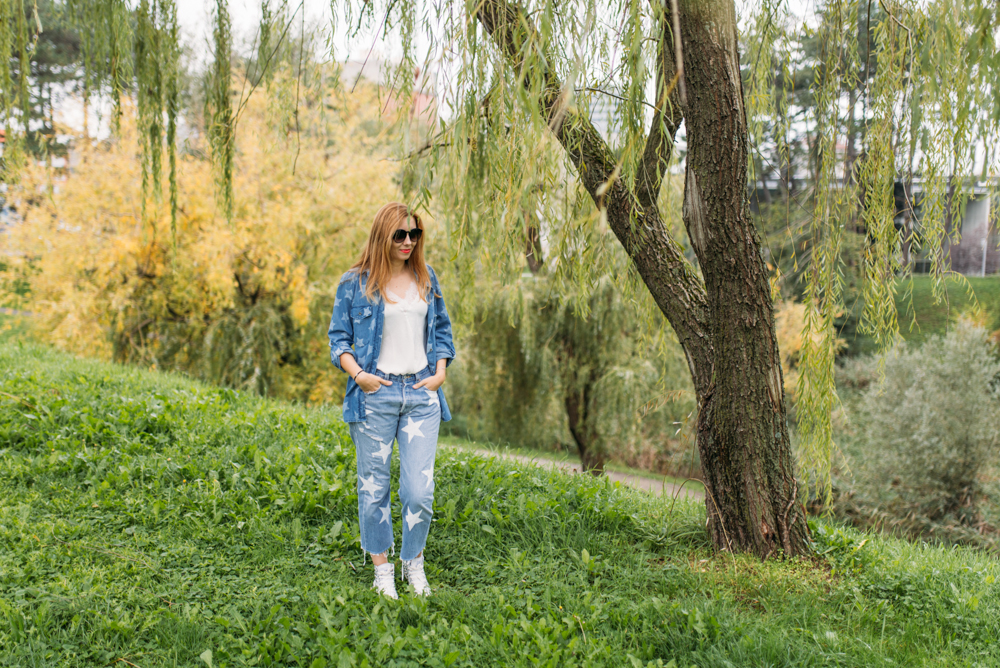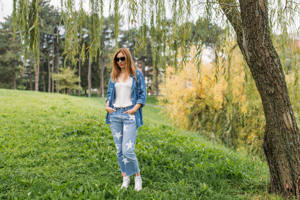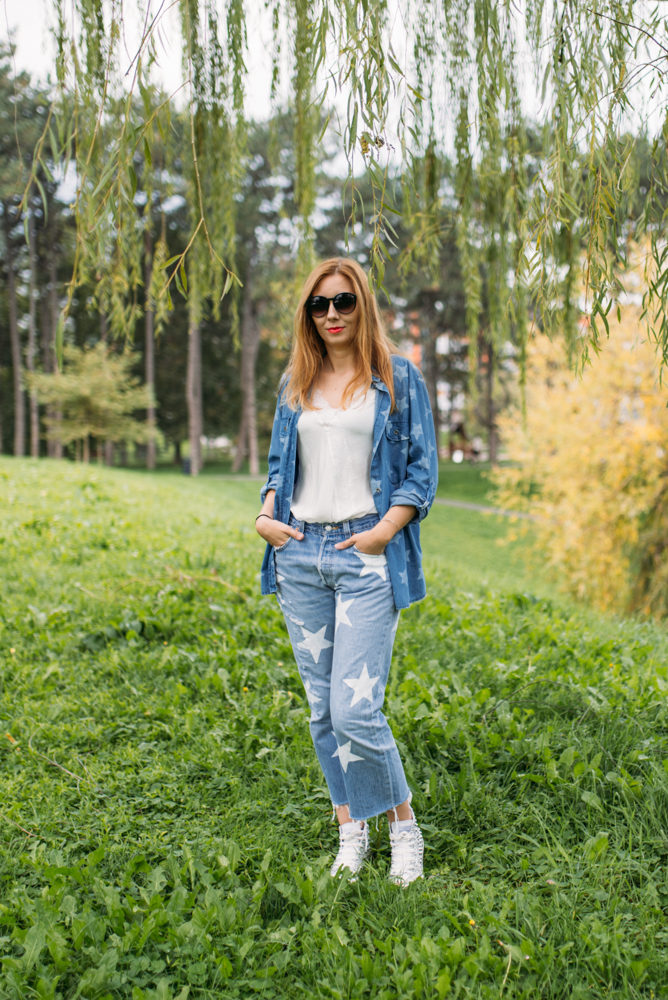 Il look di oggi è dedicato alla stampa a stelle, con un paio di jeans, un top bianco, una camicia con la stampa a stelle ed un paio di scarpe di ginnastica scintillanti. Che ne pensate del mio look scintillante?