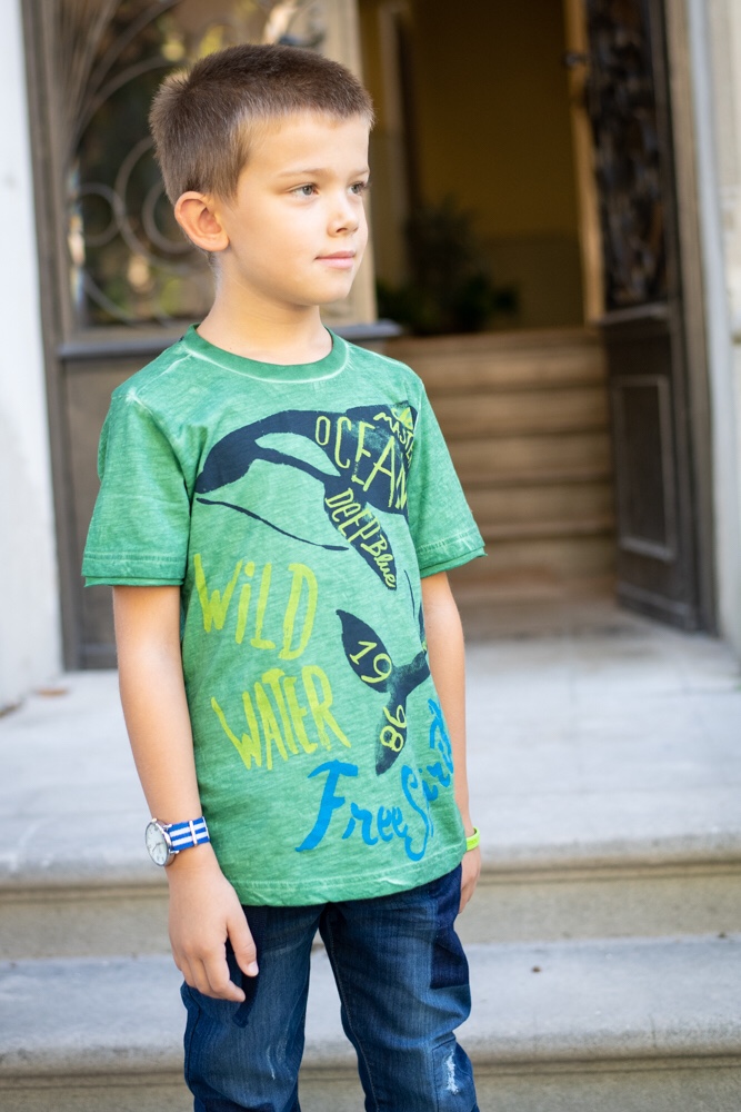 Personalmente ho iniziato a fare i primi acquisti autunnali già in estate 😉 Da quando sono diventata mamma, le prime cose che compro sono quelle per Mario e spesso succede che vado a fare shopping con l’intenzione di comprare qualcosa per me e torno a casa, invece, che ho preso delle cose per Mario e nulla per me 😉 Questa stagione sarà molto variopinta e dei colori che più trendy ve ne ho già parlato QUI. Tra i colori di tendenza, per quanto riguarda la moda bambini, c’è di sicuro il verde. Questo colore dona senza dubbio luminosità all’abbigliamento però, a volte, non è facile abbinarlo. Per Mario ho scelto un look comodo e nello stesso tempo anche molto cool 😉 Uno dei must che non passano mai di moda sono i jeans ovvero i pantaloni che sono stati inventati quasi 150 anni fa e che ancora oggi sono il capo più indossato, sia da adulti che da bambini. Ho scelto per Mario il jeans blu scuro con le toppe e li ho abbinati alla maglietta verde. In questo periodo dell’anno preferisco far indossare a Mario una maglietta corta e sopra una lunga perché lui, sudando tanto, poi toglie quella lunga e rimane in maglietta corta. Nelle giornate un po’ più calde, invece di mettergli un maglione, gli metto la giacca reversibile in tessuto tecnico. Spesso cerco i capi double face, così con un unico capo riesco a creare due look diversi. Questa giacca da un lato ha una stampa con le foglie di vari colori e dall’altro lato invece è in blu. Il look completo è firmato Boboli, il brand spagnolo che, da tempo, fa parte del guardaroba di Mario. Ho abbinato questo look a scarpe da ginnastica realizzate in pelle scamosciata, con il logo di Victoria sui lati.