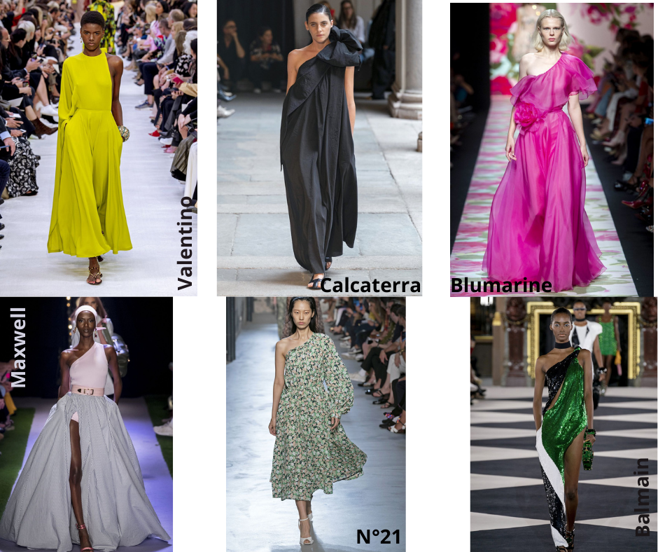 Le interpretazioni moderne di abiti monospalla traggono ispirazione dalla ricca storia di questo bellissimo vestito. Insieme a glitter e volumi eccezionali, in versioni setose e svolazzanti in rosa e bianco, questo tipo do abito ha il suo culmine nei lussuosi Anni ‘80, con tagli architettonicamente raffinati e poi nei ‘90 diventa più minimalista.