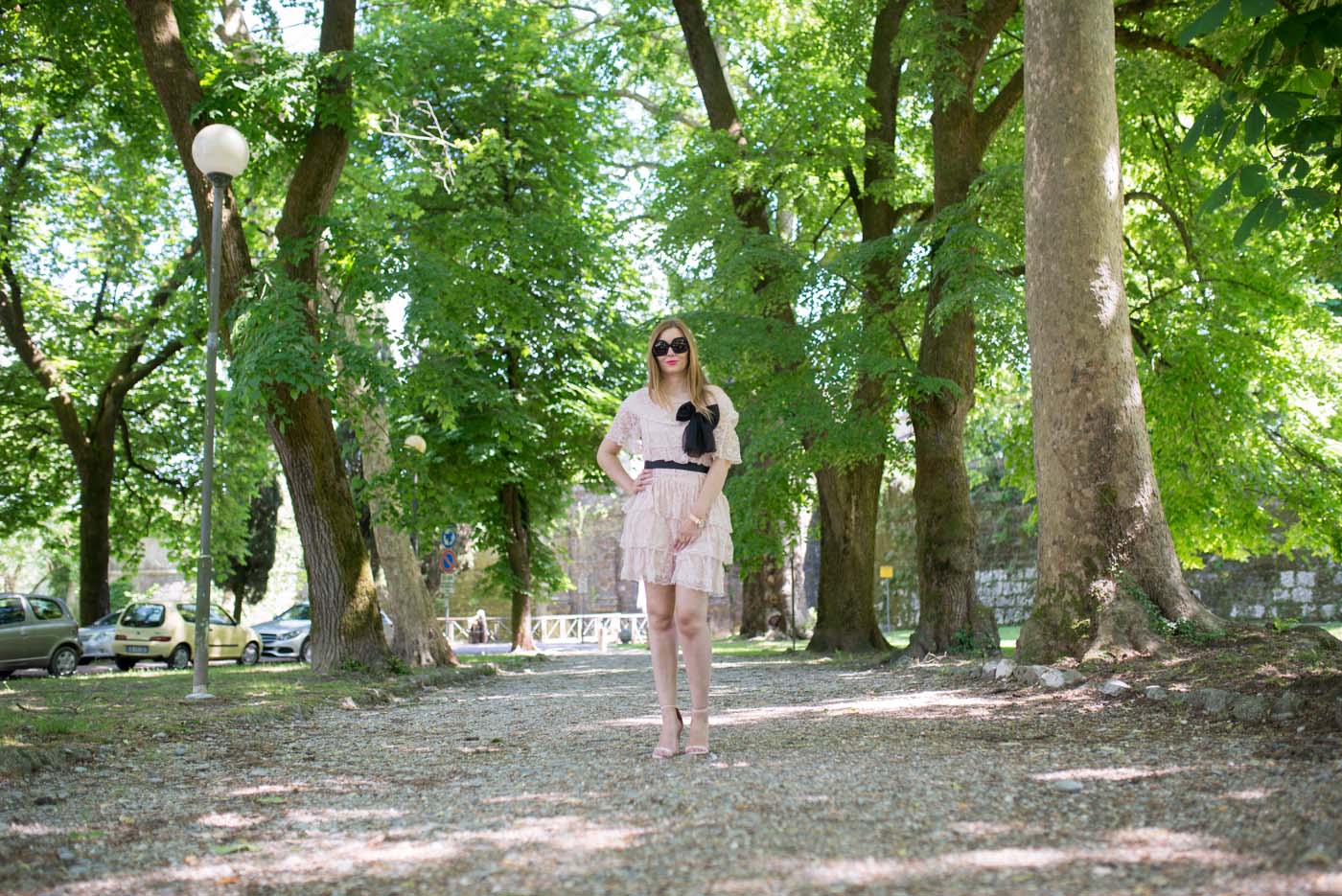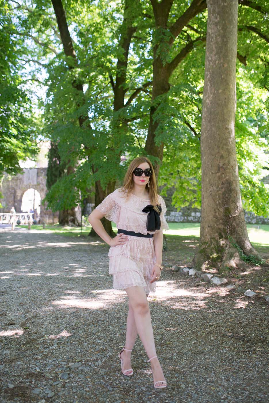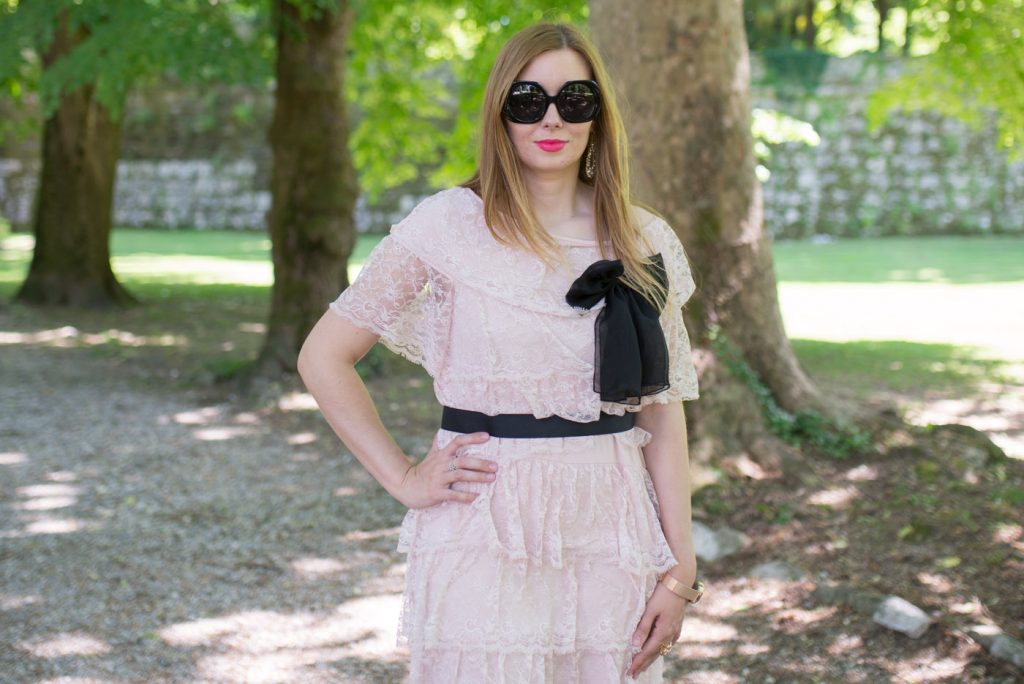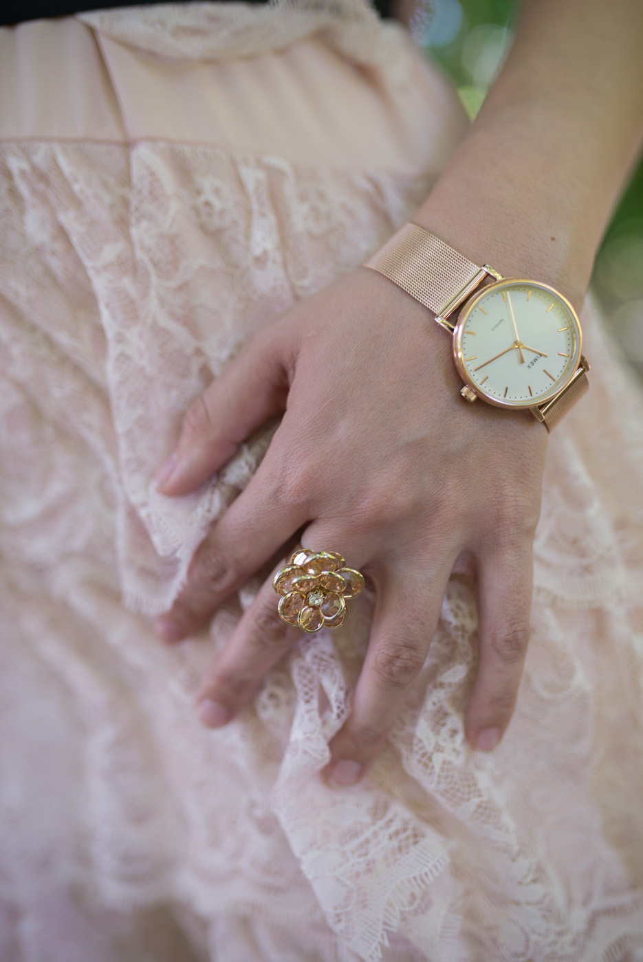 Ho abbinato all’abito in pizzo con la cintura nera ed il fiocco un paio di sandali. Ho scelto accessori dorati: un anello a forma di fiore e l’orologio firmato Timex. Del marchio Timex vi avevo già parlato QUI, solo che questa volta indosso l’orologio con cinturino in acciaio. Adoro questi orologi, perché nella notte, basta premere il pulsante e il quadrante si illumina.